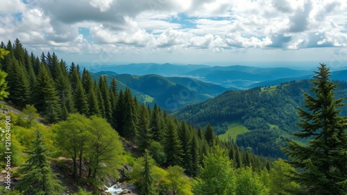 Fototapeta premium Majestic Mountain Range with Lush Evergreen Forest and Sky