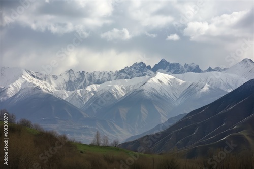 Fototapeta premium majestic mountain range, with misty clouds and snow-capped peaks, created...