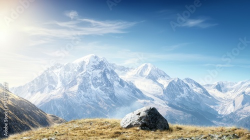 Fototapeta premium Majestic mountain range with snow-capped peaks and clear blue sky above. Majestic Mountain Range