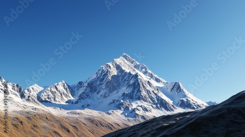 Fototapeta premium Majestic mountain range with snow-capped peaks and clear blue sky above. Majestic Mountain Range