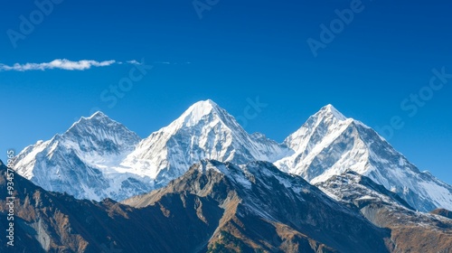 Fototapeta premium Majestic mountain range with snow-capped peaks and clear blue sky above. Majestic Mountain Range