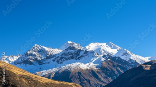 Fototapeta premium Majestic mountain range with snow-capped peaks and clear blue sky above. Majestic Mountain Range