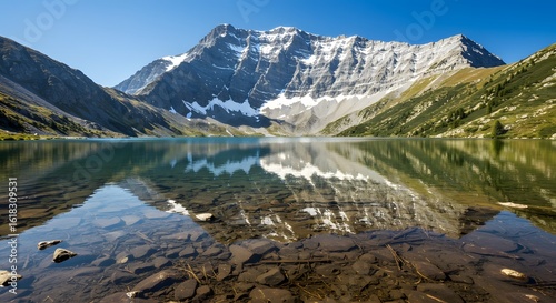 Naklejka premium Majestic mountain reflected in a pristine alpine lake.