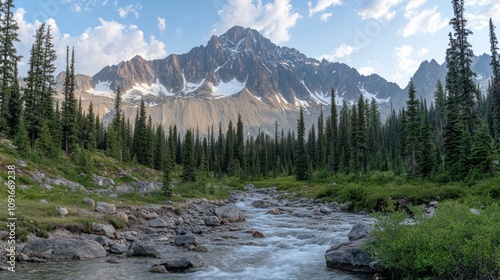Fototapeta premium Majestic Mountain River Scene With Evergreen Trees