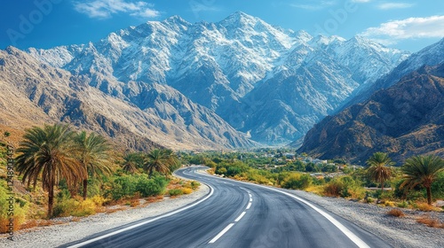 © novitasary, Fototapeta premium Majestic Mountain Road Trip: Scenic Highway Winding Through Palm Oasis