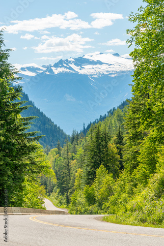 Fototapeta premium Majestic mountain road with forest foreground in Vancouver, Canada, North America. Day time on June 2024