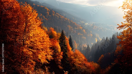 Obraz premium Majestic mountain slopes showcase vibrant autumn foliage bathed in bright...