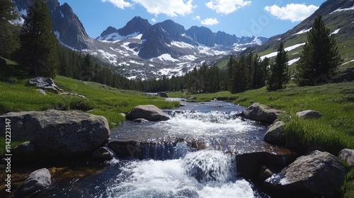 Naklejka premium Majestic mountain stream cascading through lush greenery with snow-capped...