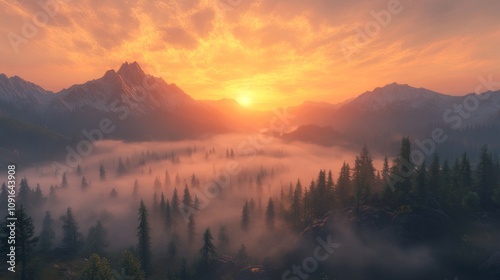 Obraz premium Majestic Mountain Sunset Over Foggy Forest Valley