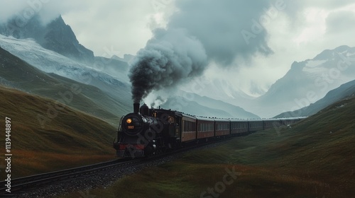 © akhmad, Obraz premium Majestic Mountain Train Journey: A Steam Locomotive Chugs Through a Breathtaking Alpine Landscape