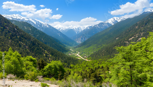 © Putu, Fototapeta premium Majestic mountain valley landscape showcasing lush greenery, a winding road, and snow-capped peaks under a vibrant blue sky. Perfect for travel, nature, and environmental themes.