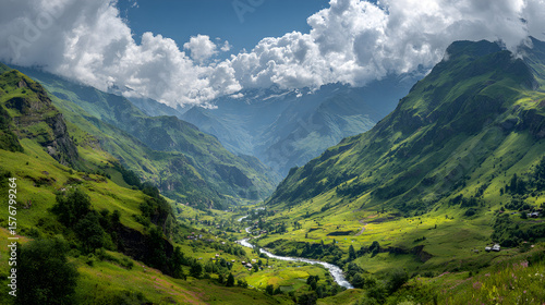 Fototapeta premium Majestic Mountain Valley Panorama with Wildflowers and a Winding River