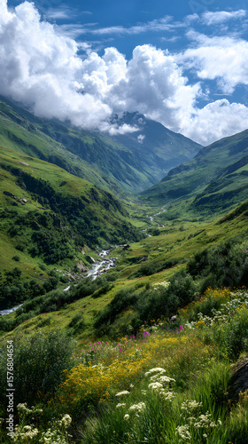 © Anthony, Fototapeta premium Majestic Mountain Valley Panorama with Wildflowers and a Winding River
