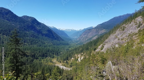 Fototapeta premium Majestic Mountain Valley Surrounded by Lush Green Forests