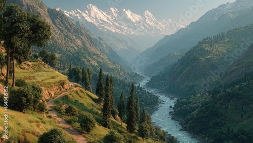 © Karen, Obraz premium Majestic Mountain Valley with Winding River and Snow-Capped Peaks