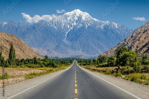 © ArtCookStudio, Fototapeta premium Majestic mountain view along a deserted highway in a remote landscape during bright daylight