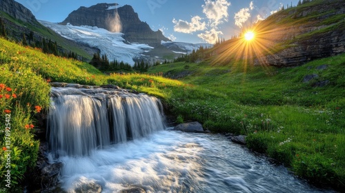 Fototapeta premium Majestic mountain waterfall at sunrise with lush greenery and snow-capped peaks