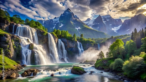 Fototapeta premium Majestic mountain waterfall in a lush green valley with a crystal clear river...