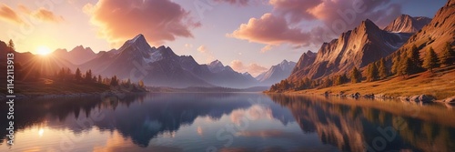 © AiGallery, Fototapeta premium majestic mountains at sunset with a serene lake, colors, misty valleys, mountain
