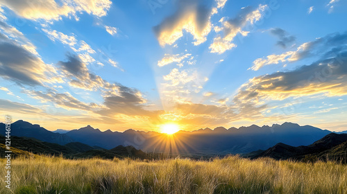 © siraphol, Obraz premium Majestic mountains silhouetted against colorful sunset sky