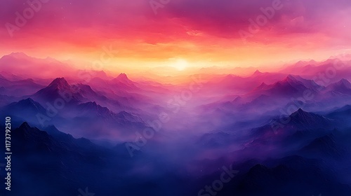 © puja, Obraz premium Majestic Mountains Sunset Hues A Vibrant Landscape