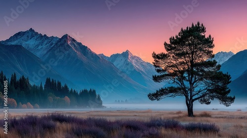 © Abdul, Fototapeta premium Majestic mountains, tranquil lake, sunrise hues