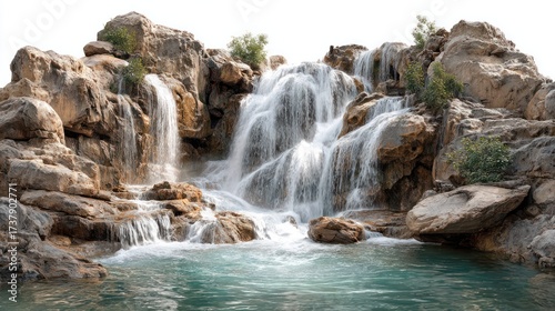 © Jeerawut, Fototapeta premium Majestic multi-tiered waterfall cascading over rugged rocky cliffs into a tranquil pool amidst lush greenery under bright natural daylight