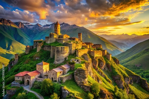 © Sirinporn, Fototapeta premium Majestic Mutso Fortress, Khevsureti, Georgia: Ancient Stone City Landscape