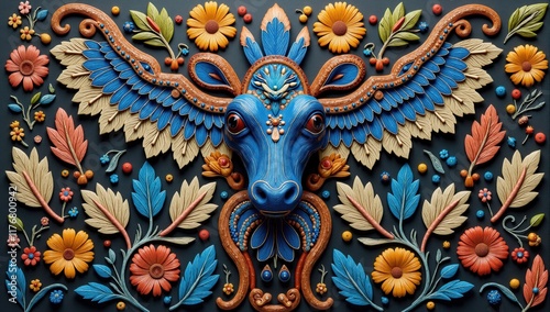 Fototapeta premium Majestic mythical blue cow with wings and floral ornaments embracing harmony