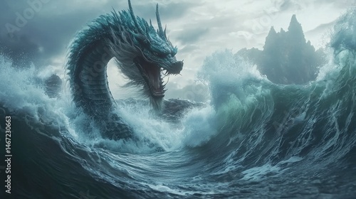 © Nuriya, Fototapeta premium Majestic mythical creature emerges from turbulent ocean waves.