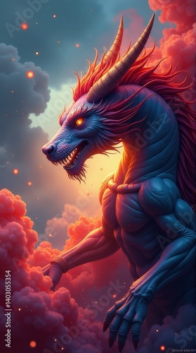 Naklejka premium Majestic mythical creature: fiery horned dragon amidst vibrant clouds. makara,vasuki,shesha,kala nag,samudra manthan,asura rahu India