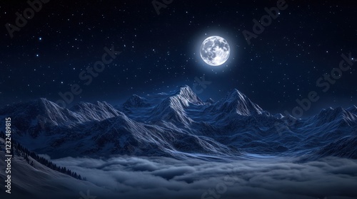 Naklejka premium Majestic Night Scene: Full Moon over Snowy Mountains
