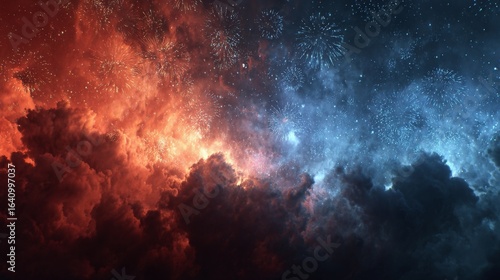 Fototapeta premium Majestic Night Sky Illuminated with Vibrant Fireworks and Dramatic Clouds in...