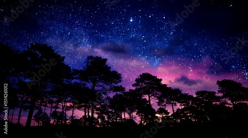 Naklejka premium Majestic night sky over silhouetted pine forest starry night