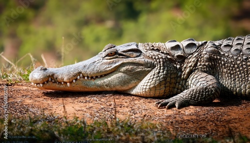 Fototapeta premium Majestic Nile Crocodile Basking Along the Shores of Ugandas Kazinga Channel,...