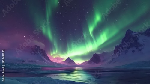 Naklejka premium Majestic Northern Lights Display Over Snowy Mountains and Icy Waterscape