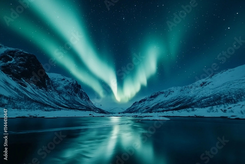 Fototapeta premium Majestic Northern Lights Over Snowy Forest Lake Landscape at Night Generative...