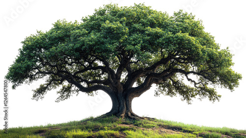 Obraz premium Majestic Oak on a Grassy Knoll: A stately oak tree, its sprawling branches laden with vibrant green leaves, stands prominently atop a grassy knoll.