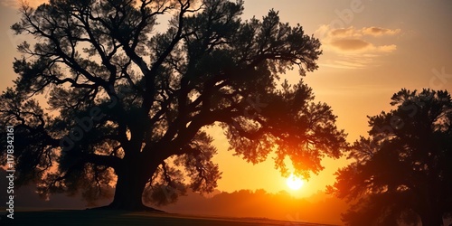 © Somnuek, Obraz premium Majestic oak tree bathed in golden sunrise light, creating serene natural scene, tranquil, landscape, serene