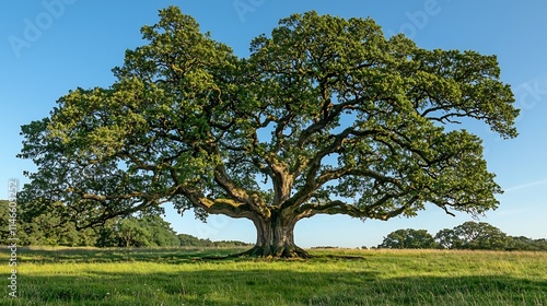 © vanilnilnilla, Obraz premium Majestic Oak Tree Dominating Serene Conservation Landscape