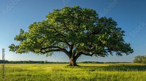Fototapeta premium Majestic oak tree in an open meadow, sprawling branches and lush green leaves, under a clear blue sky