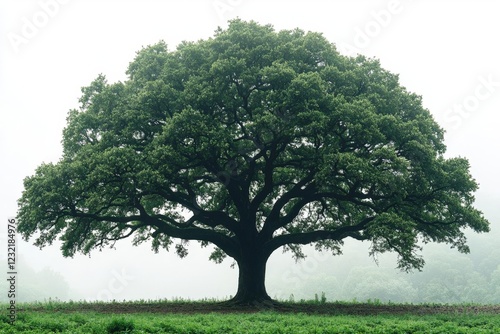 © AgungRikhi, Obraz premium Majestic Oak Tree in Foggy Landscape