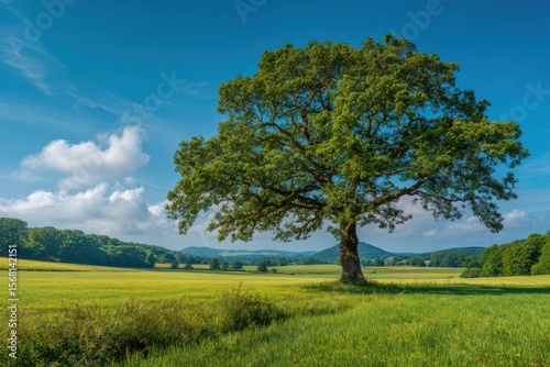 © Yevgeniy, Obraz premium Majestic oak tree in lush green field under bright sun, perfect for nature lovers and outdoor enthusiasts seeking tranquility and vibrant landscapes