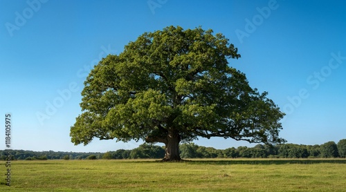 Obraz premium Majestic Oak Tree in Lush Green Field Under Clear Blue Sky
