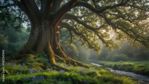 © Alepatika9023, Fototapeta premium Majestic oak tree in serene forest with sunlight filtering throught the leaves.