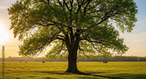 Obraz premium Majestic oak tree in sunlit pasture with grazing cows at sunset