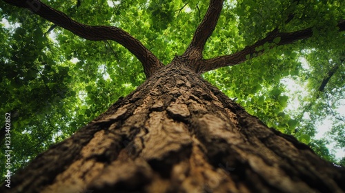 Naklejka premium Majestic oak tree, park, lush canopy, nature, low angle, environmental conservation