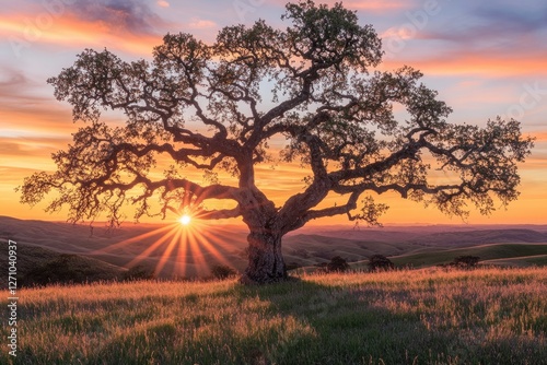 © Roshani, Obraz premium Majestic oak tree silhouetted against a vibrant sunset, casting sun rays over rolling hills.