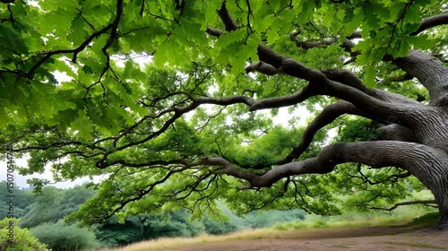© pkproject, Fototapeta premium Majestic oak tree with a twisted trunk and a rich green canopy