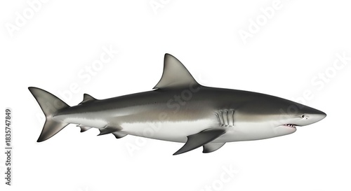 Fototapeta premium Majestic ocean predator a sleek grey shark swimming across a pristine white...